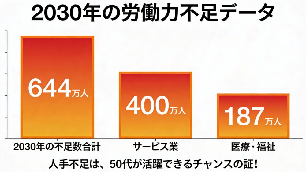 パーソル総合研究所のデータによると、2030年には日本全体で644万人の労働力が不足すると予測されています。特に以下の分野では深刻です。